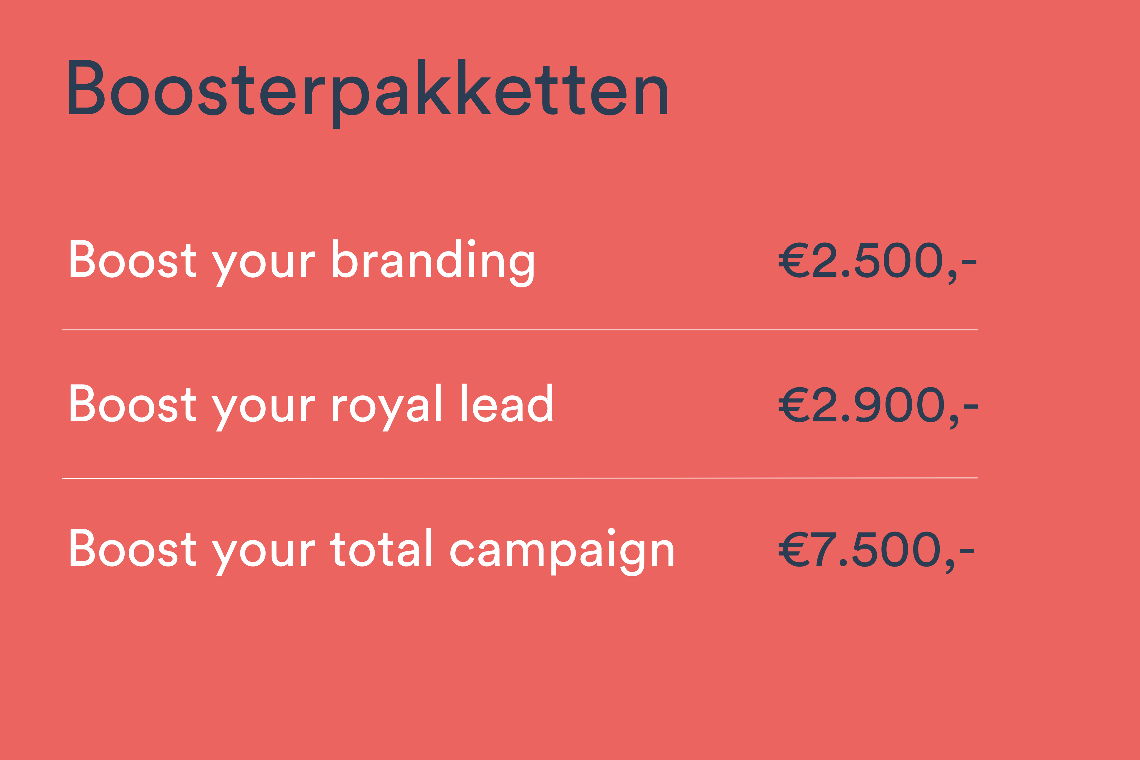 Bekijk op deze pagina alle prijzen, deelname- en boosterpakketten.