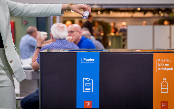 Binnen alle gebouwen van Jaarbeurs vind je gescheiden afvalbakken. Materialen als papier en plastic worden zo voor een groot deel hergebruikt. Dat bespaart nieuwe grond­stof­fen, energie en geld.